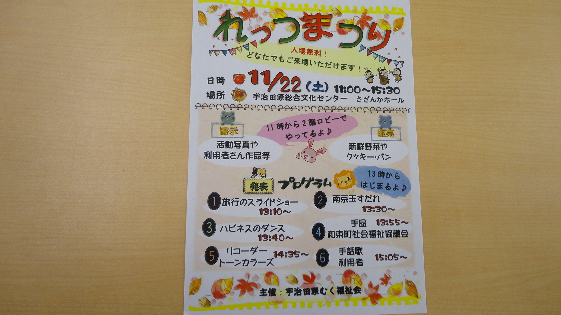 2023「れっつ祭り」11月25日(土)10:00~15:30宇治田原町総合文化センター2Fさざんかホール3F研修室(入場無料)10:00~新鮮野菜・クッキー・パン販売。展示(活動の様子・利用者作品)スタート。12:30さざんかホール開場、受付開始。13:00開演、スライドショー。13:30利用者舞台発表。14:15フォークグループ「ひょうたん島」演奏。15:30終了どなたでもご来場いただけます。